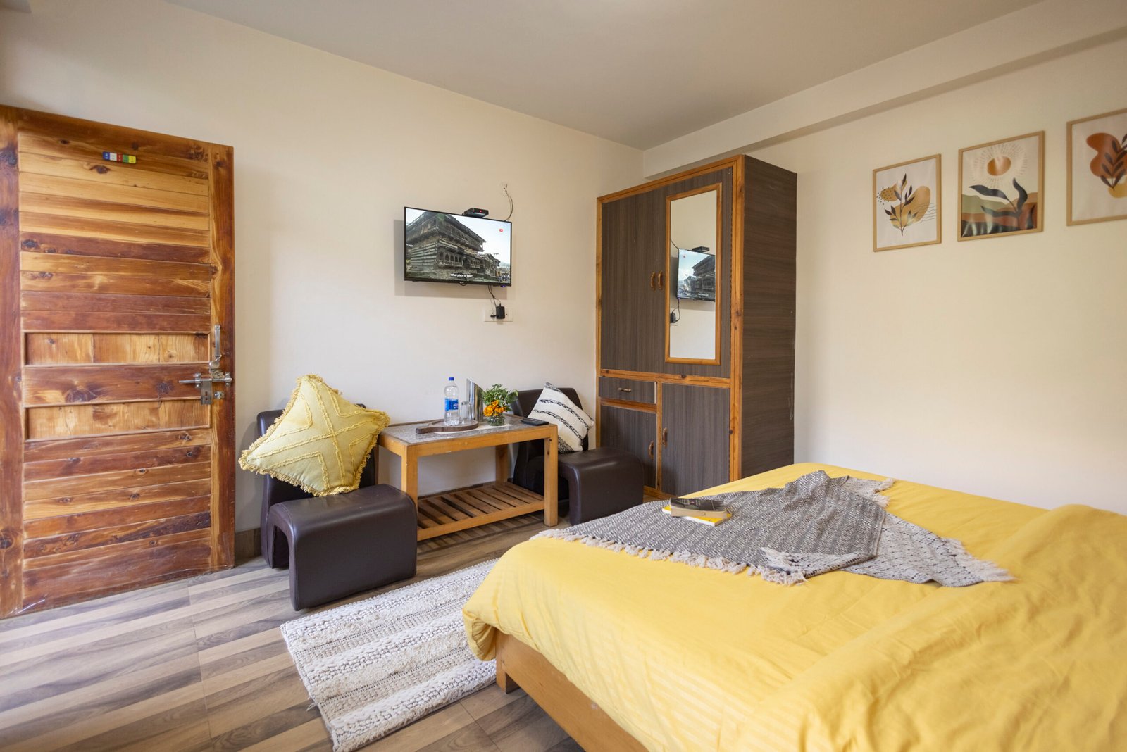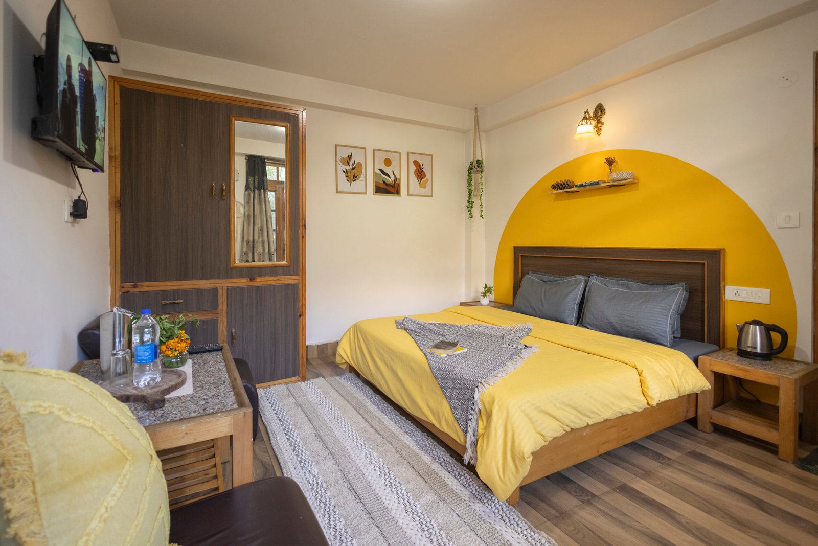 This cosy and peaceful room is thoughtfully designed for comfort, offering everything you need for a relaxed and refreshing stay. It features elegant wooden interiors, a TV for entertainment, cushioned chairs, a coffee table, and ample storage with a wardrobe and side tables. Modern essentials, such as Wi-Fi, an electric kettle, and a geyser, ensure a smooth and comfortable experience. Step outside and soak in the pure mountain air of the Himalayas. At Yaarana, we believe in creating spaces that feel like home in the mountains. Our Premium Garden View Room invites you to slow down, breathe deep, and enjoy Manali not as a tourist, but as someone who truly belongs.
