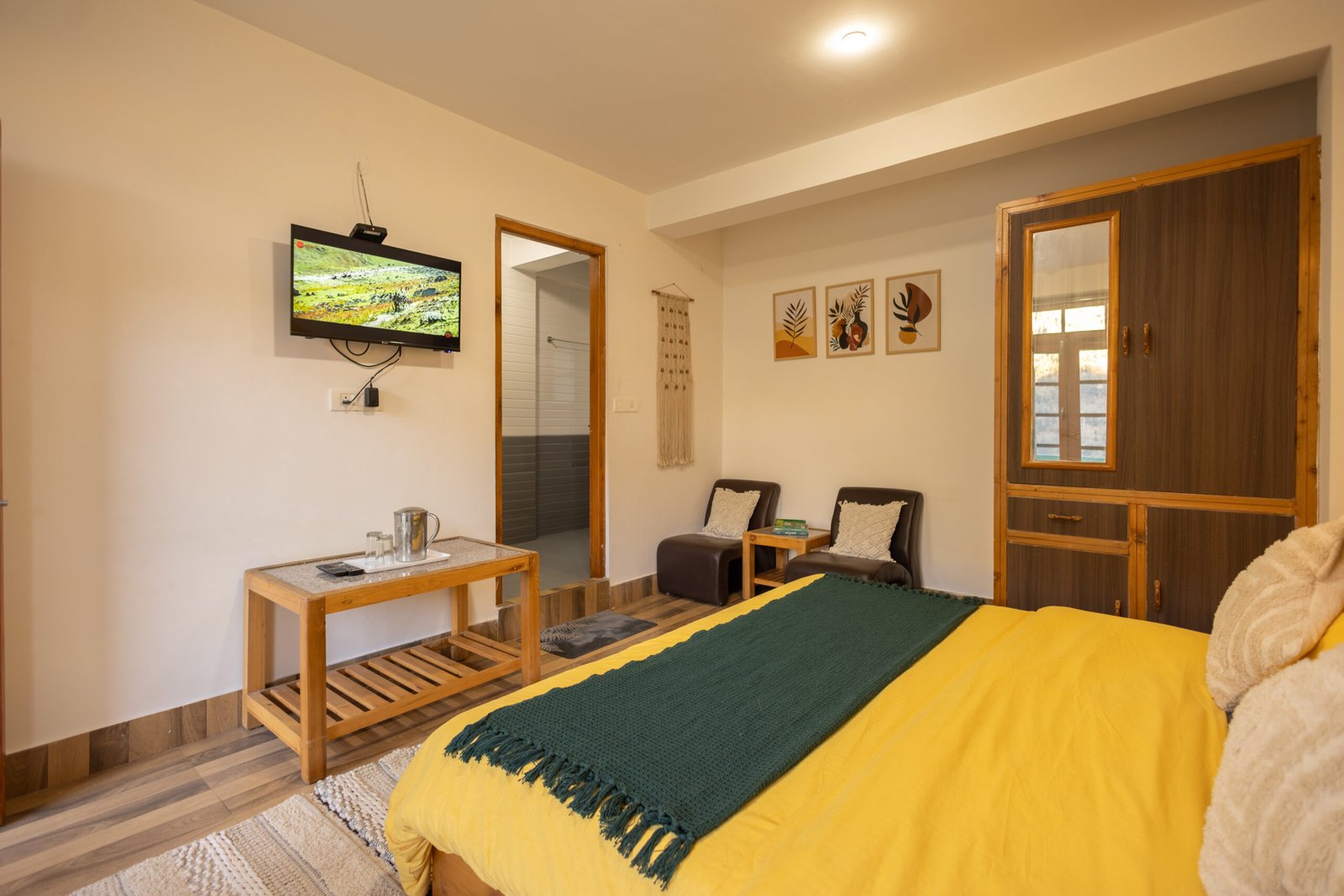 Experience Our newly built Premium Garden View Room blends comfort with mountain charm. Thoughtfully designed with warm wooden interiors, it features a TV, high-speed Wi-Fi, electric kettle, cushioned chairs, and ample storage. Perfect for solo travellers, couples, or remote workers, this peaceful room in Manali offers everything you need for a calm, cozy, and refreshing stay amidst nature.