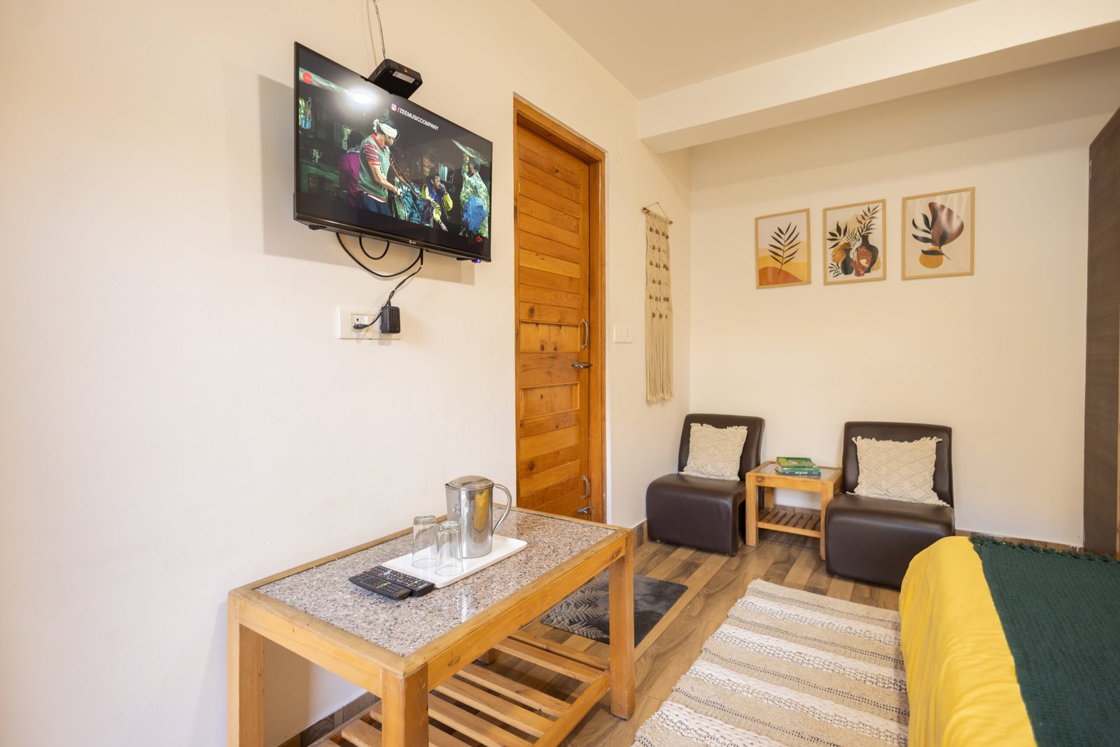 The room includes a TV, cushioned chairs, a coffee table, wardrobe, side tables, and a clean, spacious washroom. There’s also Wi-Fi and an electric kettle for your convenience. Just a few steps from the rooftop café, it’s great for quick meals or evening chai with a view. A comfortable, practical choice for solo travellers, couples, or remote workers looking for a simple and peaceful stay.