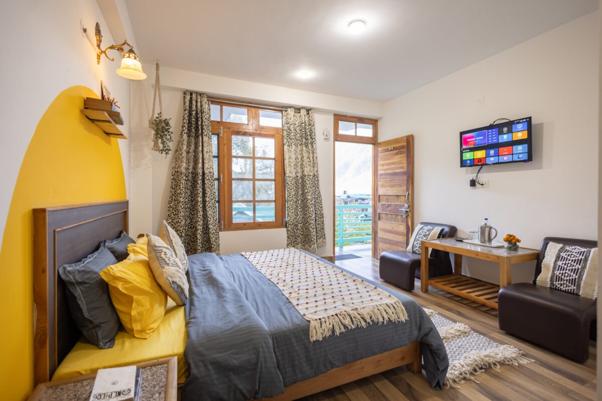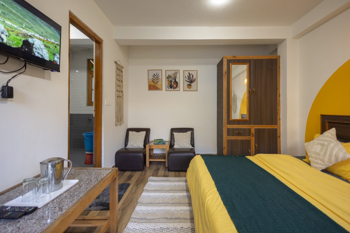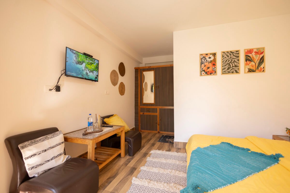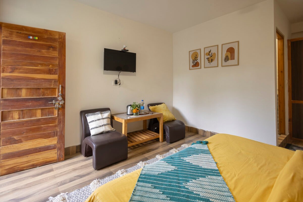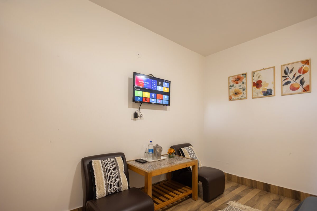 Situated on the first floor between the garden and our scenic rooftop café, this cosy premium room strikes the perfect balance between privacy and connection. Thoughtfully designed for comfort and ease, it features a TV, coffee table, cushioned chairs, wardrobe, side tables, and a spacious washroom. It’s a peaceful and budget-friendly space to focus, relax, and soak in the essence of mountain living.
