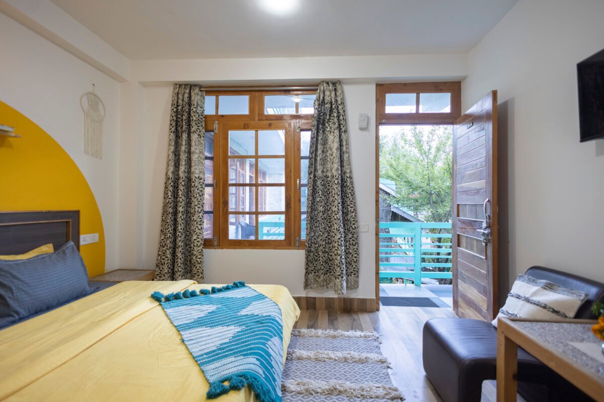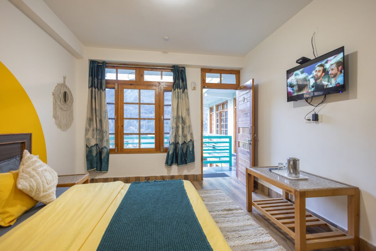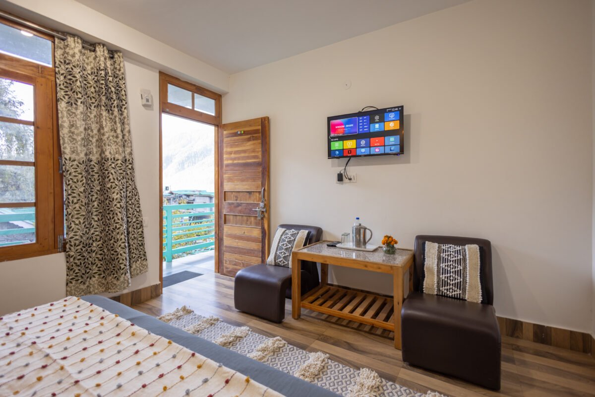 Experience Our newly built Premium Garden View Room blends comfort with mountain charm. Thoughtfully designed with warm wooden interiors, it features a TV, high-speed Wi-Fi, electric kettle, cushioned chairs, and ample storage. Perfect for solo travellers, couples, or remote workers, this peaceful room in Manali offers everything you need for a calm, cozy, and refreshing stay amidst nature.